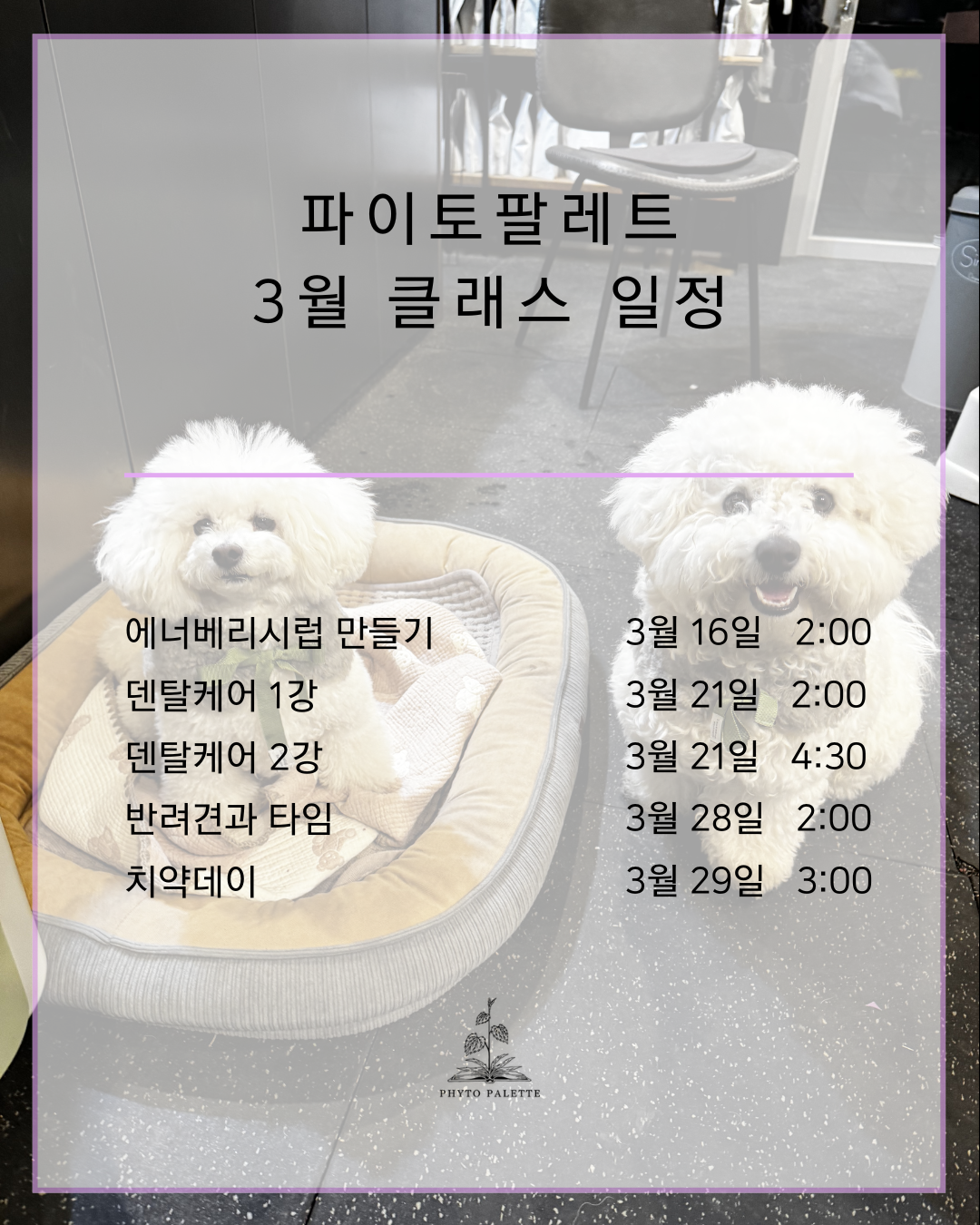 파이토 팔레트 3월 허브 클래스 일정입니다.에너베리시럽 만들기: 반려견의 전반적인 신체 항산화에 기여를 하는 로즈힙에 대한 수업입니다.즉각적인 효과가 나타나는 항산화 허브 중 하나가 바로 로즈힙입니다.활동량이 많은 반려견 부터 기력이 쇠한 노견까지모두에게 급여하기 좋은 허브 로즈힙에 대해 배워보세요.실습으로 로즈힙시럽 1개, 에너베리시럽 1개 이렇게 두가지 버전의 시럽을 만들어 가십니다.덴탈케어 1강:치약 완제품에 들어가는 부가재료이기도 한 진지발몽오일 입니다.진지발몽오일은 제가 지어낸 이름입니다. (gingival + balance + 몽몽이 + oil)바로 몽몽이의 잇몸 균형을 위한 허브 오일입니다.잇몸에 바로 적용하셔도 되고 피부에 발라도 좋은 오일입니다.덴탈케어 2강:1강에서 만드는 방법을 배우신 부가재료를 이용해메인 재료인 프로폴리스를 더해 치약 완제품을 만드는 수업입니다.치약을 직접 만들어 사용하시다가 나중에 그냥 다시 시중 제품을 구매하셔서 써보신 후결과적으로 다시 만들어 사용하시는 분들이 많으실 정도로 만족도가 높은 치약입니다.반려견들의 호응도도 좋은 치약입니다.반려견과 타임:봄철 미세먼지 시즌이 걱정되신다면 꼭 들으세요!강력한 항균 작용으로 호흡기에 도움이 되는 타임 허브에 대해서 배우십니다.타임코프 시럽 1개, 뮤실코프 시럽 1개 이렇게 총 2가지의 시럽을 만들어 가십니다.타임 허브를 배우시면 타임은 호흡기에만 사용하는 것이 아니라피부, 귀에 사용하기에도 좋은 허브라는걸 알게 되십니다.여름철 장염 관리에도 좋은 허브이니 미리 배워두시면 좋겠지요?치약데이:덴탈케어 1강과 2강을 모두 들으신 분들만 참여가 가능하신 치약데이 입니다.별도의 수업이 있는 것이 아니라 제가 덴탈케어 수업때 알려드린 재료들을 미리 준비를 해드립니다.직접 오셔서 재료들을 섞어 만들어 가시면 되며 기본 30g 치약 2개 만들어 가시는 것입니다.이번달까지 오프라인으로 진행되고4월이나 5월부터는 가정에서 직접 만들어 보실수 있게 재료를 택배로 보내드릴까 싶기도 합니다. 제가 요즘 안타깝게 느끼는 점이 하나 있습니다.허브는 미리 배워두시면 평상시에도 일상적으로 활용할 수 있고,무엇보다 반려견의 건강에 문제가 생겼을 때 특히 유용하게 사용할 수 있습니다.그런데 많은 분들이 이 약, 저 약을 모두 써보신 뒤에도 해결되지 않을 때비로소 허브를 찾으시는 경우가 있습니다.하지만 그런 상황에서는, 제가 판단하기에 이미 허브를 적용하기에는 애매한 단계에 이른 경우들이 적지 않습니다.차라리 약을 사용할 정도로 상황이 진행되기 전에,초반부터 허브를 일상적으로 활용해 보셨다면 얼마나 좋았을까 하는 아쉬움이 남는 경우들이 있습니다.한편 미리 허브를 배워두신 분들께서는 반려견의 건강 문제로 허브 적용이 고민될 때언제든 저에게 문의를 주시면 제가 알고 있는 범위에서 기꺼이 도움을 드리고 있습니다.하지만 허브 수업을 전혀 듣지 않으신 분들께서 급하게 상담을 요청하시는 경우에는,제가 도와드릴 수 있는 방법이 현실적으로 많지 않습니다.급한 상황에 한 분만을 위해 별도의 수업을 열어드릴 수도 없는 상황이기 때문입니다.저는 허브를 배우는 일이 단순히 지식을 익히는 것을 넘어,삶의 지혜를 알아가는 과정이라고 생각합니다.자연이 주는 이로움을 일상 속에서 천천히 실천해 보시길 바랍니다.