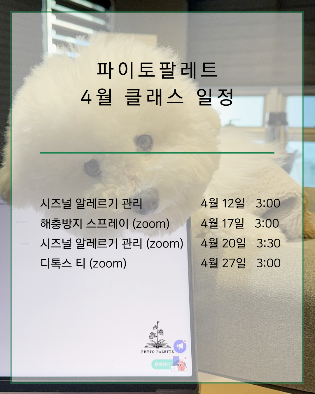 저희 공방 근처 벚꽃 명소 희우정로에 벌써 벚꽃들이 많이 폈습니다.여러분!! 수업은 줌으로 들으셔도 저희 동네 놀러오세요. 4월 클래스 일정 안내드립니다.이번 달에는 새롭게 개강하는‘시즈널 알레르기 관리 허브’ 수업을오프라인 / 온라인 zoom 각 1회씩 진행합니다.지난 피드에서 소개해드렸던 카모마일, 플랜타인, 네틀, 그린 루이보스 등의 허브를어떤 상황에서 어떻게 블렌딩하여 활용해야 하는지를 중심으로 알려드립니다.최근에는 사이토포인트, 아포퀠과 같은 방법으로 알레르기 관리를 많이 하시지만,이러한 방식에는 분명한 한계가 있습니다.알레르기 반응은 단순한 피부 가려움뿐 아니라 점막, 면역, 전신 반응으로 확장되는 문제이기 때문입니다.본 수업은 실습 없이 이론 중심으로 진행되며,각 허브를 직접 경험해보실 수 있도록 소량의 샘플을 제공해드립니다.참고로 그린 루이보스가 기가 막히게 향기롭고 맛있습니다.요즘 제가 벌컥벌컥 마실 정도인데 계절감과도 잘 맞아 떨어져요. 또한 날씨가 빠르게 따뜻해짐에 따라해충방지 스프레이 만들기 수업을 Zoom으로 진행합니다.이번 클래스는 새롭게 입고된 에센셜 오일을 기반으로 진행되며,수업 종료 후에는 DIY KIT 신청도 오픈될 예정입니다.(수강생에 한해 신청 가능) 여름철은 반려견이 다양한 화학물질에 노출되는 시즌입니다.내·외부 구충제, 공원의 제초제 및 살충제 등으로 인해 노출 부담이 높아지는 시기입니다.이러한 환경 속에서 내부적인 밸런스를 돕기 위한 디톡스 티 수업도 함께 오픈합니다.디톡스 티는 담낭 슬러지 관리에 활용되는 단델리온 루트를 중심으로,전반적인 간 건강을 위한 허브 구성을 다루는 수업입니다.해당 수업 역시 실습 없이 이론 중심으로 진행됩니다.
