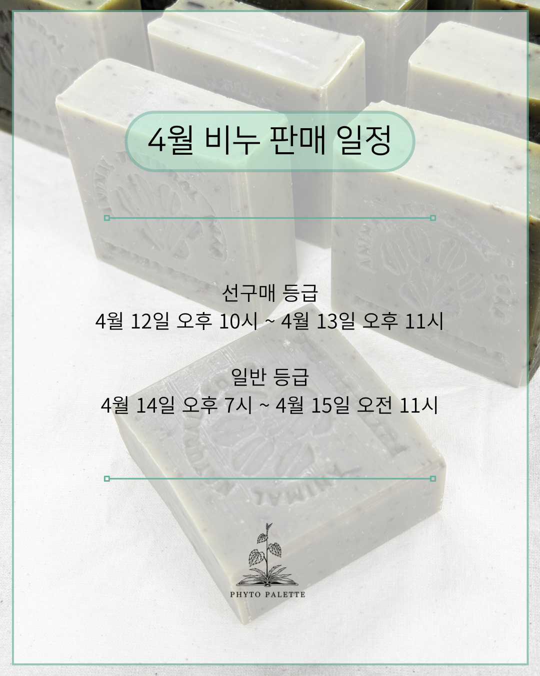 안녕하세요. 파이토 팔레트 4월 비누 일정입니다. ✔️ 이번 달 비누는 스페셜 비누가 몇 가지 있습니다.그중 첫 번째가 자엘타 비누입니다.자운고의 핵심 원료인 자초,엘레미 수지,타마누 오일로 이루어진 자엘타 비누에네틀 (Nettle) 비네거까지 들어가서부드러운 컨디셔닝 효과까지 느끼실 수 있습니다.이번 달에만 스페셜로 네틀 비네거가 들어간 것이니 놓치지 마세요! ✔️ 월식이 비누에는스페셜로 슬리퍼리엘름 (유근피) 추출액이 수상으로 전량 들어갔습니다.그래서 기존 월식이 보다 수분감이 더 느껴지실 거예요. 그리고 비누에 첨가하게 된 슬리퍼리엘름에 의해 비누 표면에 거미줄처럼 흐르는 무늬가 보이는글리세린 리버 현상이 일어났습니다. 재료에 의한 구조적인 현상으로 정상 비누입니다. ✔️ 뽀식이 비누와 베식이 비누에 해충 방지 포뮬려 에센셜 오일이 들어갔습니다.그래서 기존의 뽀식이, 베식이 비누와 향이 다릅니다.해충방지 스프레이를 뿌리는 만큼의 강력한 해충 기피 효과가 있는 것은 아니지만집안에서 편안하게 잠을 자기에는 괜찮은 정도입니다.오히려 밀폐된 공간 안에서 해충 방지 스프레이를 뿌리는 것은 권장되지 않습니다. ✔️ 비누망은 판매하지 않고 비누 2개당 비누망 1개씩 증정해드릴 예정입니다. ✔️ 비누에 관한 문의는 사이트 게시판을 이용해 주세요.제가 전화를 잘 못받습니다.디엠 문의의 경우 제가 바로 답장을 못해드리는 상황에서는제가 문의글을 읽기만 하고 넘어가게 되는 상황이 자주 생깁니다.그래서 추후에 답을 못드리고 문의글이 뒤로 밀리기만 해서 문의가 있었다는 것 자체를제가 잊어버리게 됩니다.그러니 사이트 게시판을 이용해 주세요. 🌿 선구매 등급4월 12일 오후 10시 ~ 4월 13일 오후 11시 까지 🌿 일반회원 등급4월 14일 오후 7시 ~ 4월 15일 오전 11시 까지4월 15일 오전 11시까지 입금 완료된 비누만4월 15 ~ 4월 16일 부터 출고.15일 오전 11시까지 미입금시주문은 예고없이 취소될 수 있습니다. << 준비된 비누 및 구매 가능 수량 >>▫️자엘타 스페셜 (네틀ACV), 월식이 스페셜 (슬리퍼리),베식이 (해충), 뽀식이 (해충), 타식이, 캄식이, 허식이 ▪️무통장 입금 주문건은1시간 이내로 입금해주셔야 결제완료처리 됩니다.1시간 이내에 입금해주지 않으시면 결제가 취소되세요. 🔸무통장 입금의 경우 자동화시스템에 의해 처리가 됩니다.결제확인이 될때까지 최대 6시간이 소요되실 수도 있으세요. ▪️반드시 입금자 성함과 결제금액을 주문건마다 일치시켜 입금해주세요.더하기 하셔서 한번에 입금하시거나 조금의 차액 차이가 나도 결제완료가 되지 않습니다. 혹시라도 실수로 나눠서 입금하셨을 경우 BOARD에 글을 남겨주세요. 확인해드리겠습니다.입금 확인은 자동화 시스템으로 처리되므로 전산상 잘 처리가 되도록 꼭! 주문건 마다 주문자 성함과 입금자 성함을 일치시켜주문건 마다의 금액을 정확히 입금해주시길 바랍니다. ▪️입금하셨는데 결제 시점으로부터 6시간 이내에 마이 페이지에서‘결제완료’ 라고 뜨지 않는다면 BOARD에 글 남겨주시길 바랍니다.(전화하지 말아주세요) ▪️공지된 날짜 이후에도 비누창을 열어두겠습니다. 다만 공지된 날짜 이후에 주문하시는 비누들은 좀 늦게 받으시게 됩니다.(약 일주일에서 이주일 소요) ▪️합배송은 한 아이디에 한해서만 가능합니다.합배송 신청은 주문 즉시! 사이트 내에 있는 SHIPPING 메뉴에 글을 남겨주시길 바랍니다. 주문번호들을 남겨주세요. ▪️합배송 신청은 주문 즉시 SHIPPING 메뉴에 신청해두세요. 비누 오픈 후 1시간이 지나서 부터는 택배사에 바로 송장을 넘기기 때문에 늦게 신청하시는 경우 합배송이 불가 하십니다. 배송비 차액은 적립금으로만 지급됩니다. ▪️현금영수증은 다른 번호로 발급받고 싶으시면 발급을 원하시는 번호를 기입해주세요. 🔸 ‘배송준비' 상태로 넘어간 비누는 주문 취소가 불가합니다.취소를 원하실 경우 비누를 일단 받으시고 다시 반품접수를 해주셔야 하며 왕복 택배비를 부담하셔야 합니다.